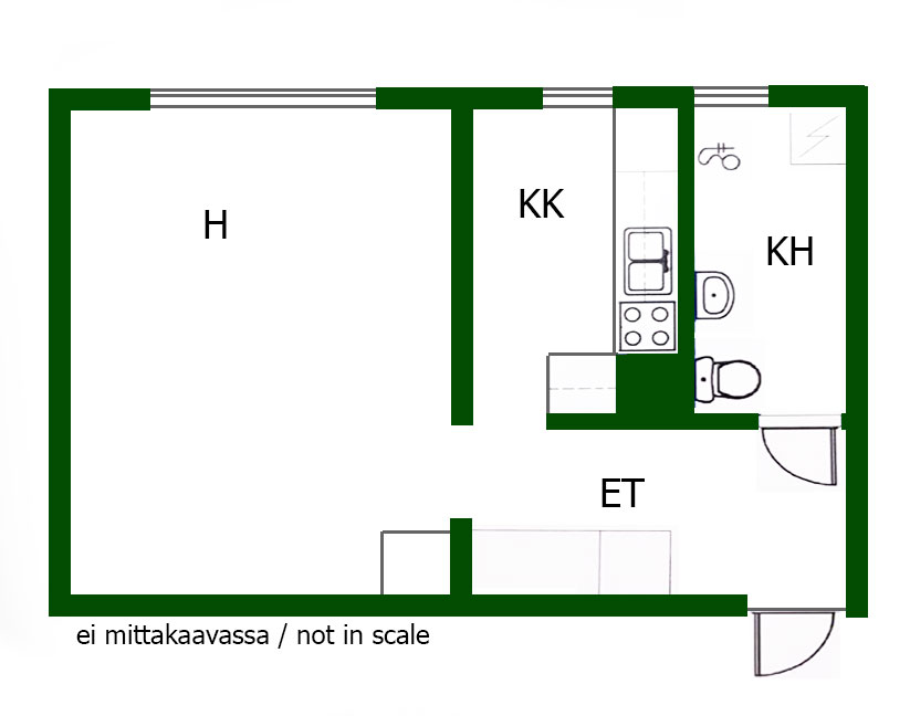 Nice apartment with one room, a small kitchen and bathroom. On floor one out of three. Windows are faced roughly towards south.